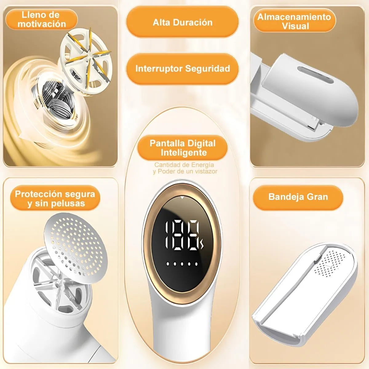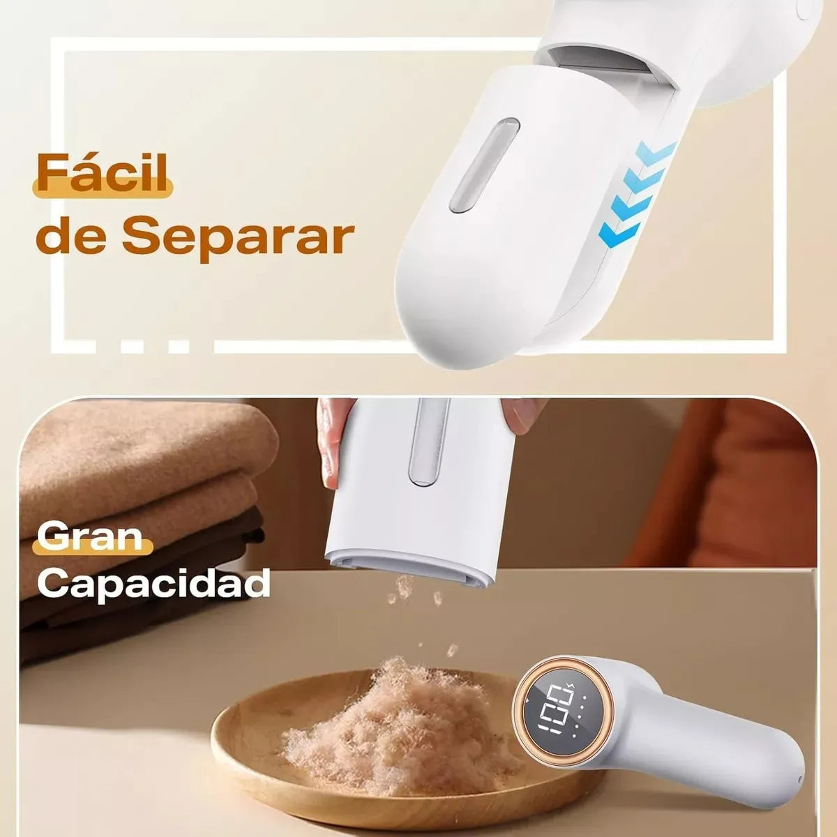Su bandeja de almacenamiento transparente y desmontable permite recoger mayor cantidad de pelusas antes de vaciarla, ofreciendo mayor comodidad durante el uso. Su diseño portátil recargable lo hace ideal para eliminar bolitas de tus prendas o muebles en cualquier lugar. El motor eficiente y la fuerte succión dejan tus tejidos limpios y como nuevos, protegiéndolos de forma efectiva.